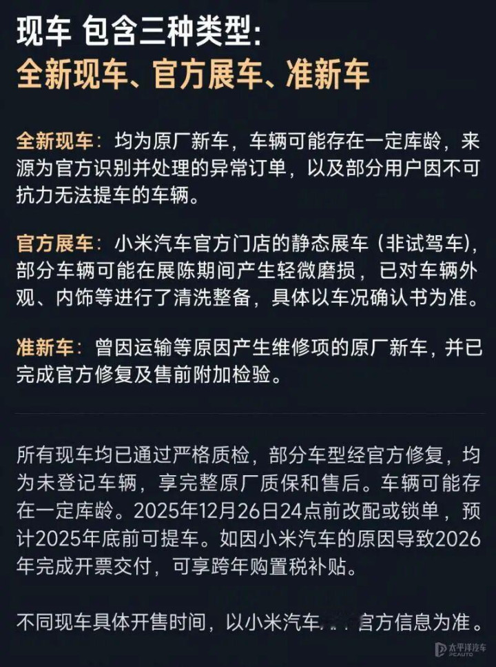 小米汽车此次提供的现车资源覆盖三种类型。全新现车为原厂新车,来源主要是官方识别处理的异常订单,以及部分用户因不可抗力无法提车的车辆。官方展车指小米汽车官方门店的静态展示车辆(非试驾车),这些车辆在展陈期间可能产生轻微磨损,但均已经过清洗整备。准新车是此次新增的重点品类,指曾因运输等原因产生维修项的原厂新车,这些车辆已完成官方修复及售前附加检验。